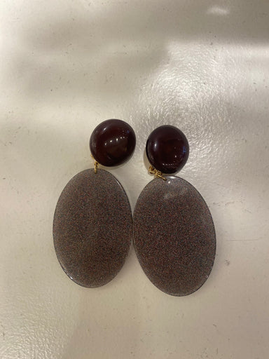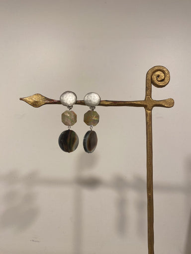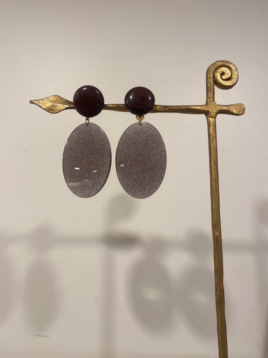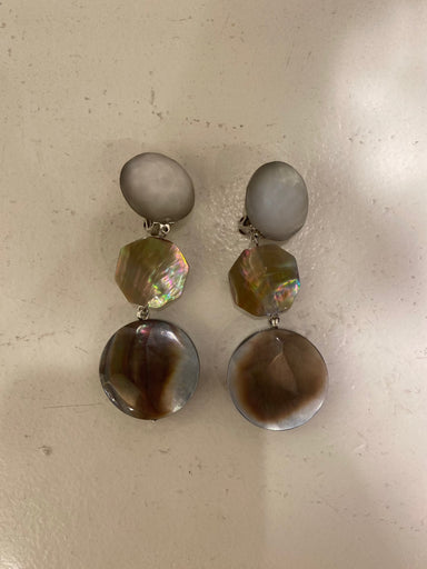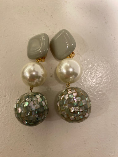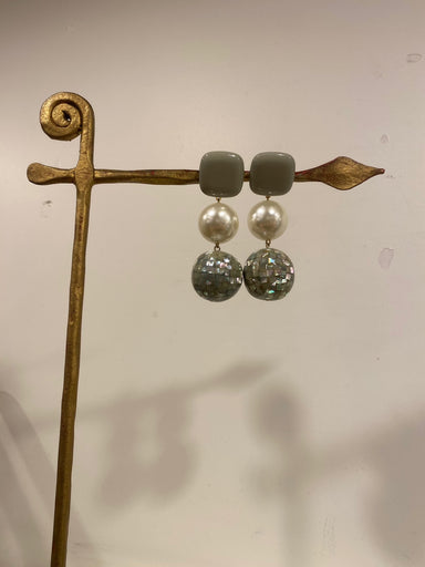 Boucles d’oreilles Francine Bramli en résine, perle et nacre grise – Élégance céleste et contraste raffiné